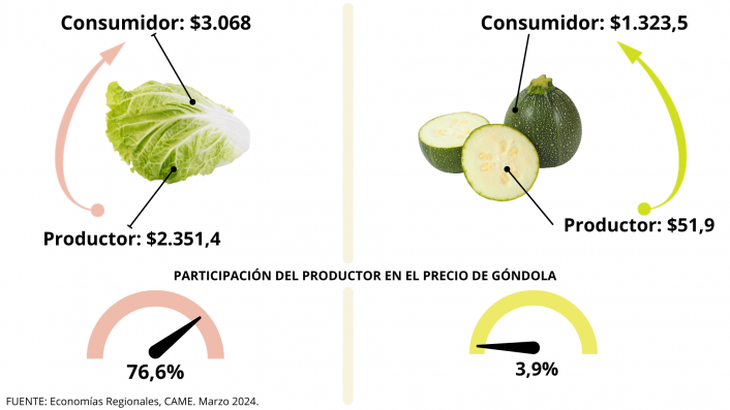 En promedio, la participación del productor explicó el 31,3% de los precios de venta final. La mayor participación la tuvieron los productores de lechuga (76,6%), mientras que la menor fue para los de zapallito (3,9%).