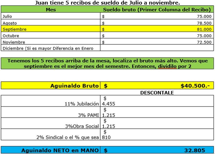 Importante: El Aguinaldo se cobra el 18 de diciembre, motivo por el cual, el mes de diciembre no se toma de base AHORA, sino que, si diciembre llega a ser el mejor mes, se paga la diferencia en ENERO con el sueldo de diciembre
