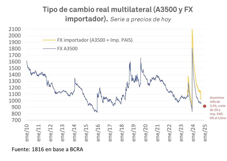 A través de un informe, la consultora 1816 pronosticó que, si la inflación mensual del último cuatrimestre promedia el 3,5% y el Banco Central (BCRA) sostiene el ritmo de ajuste del dólar oficial cercano al 2%, "el tipo de cambio importador será en términos reales el más bajo en 20 años, con excepción de los dos grandes atrasos cambiarios de esta década", que se vieron sobre el final del mandato de Cristina Fernández en 2015 y en el epílogo del gobierno del Frente de Todos en 2023. Esto se daría, además, por la eliminación del impuesto PAIS.