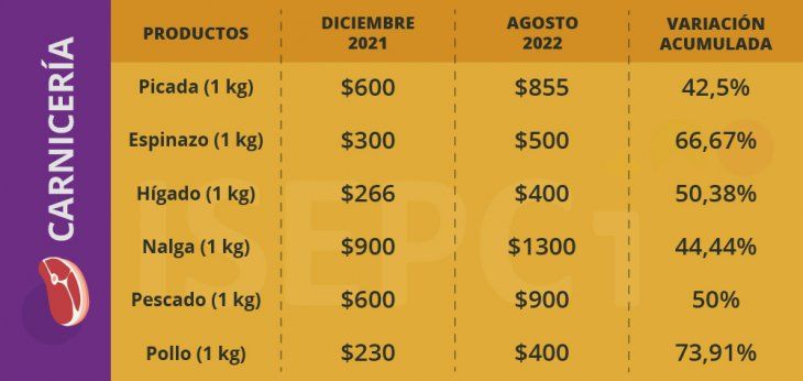 Asimismo, los productos de carnicería que más subieron en el año fueron el kilo de carne picada (+42,5%); el kilo de espinazo (+66,7%) y el kilo de hígado (+50,4%). En tanto, el kilo de pollo registró un aumento de 73,9% en ocho meses.