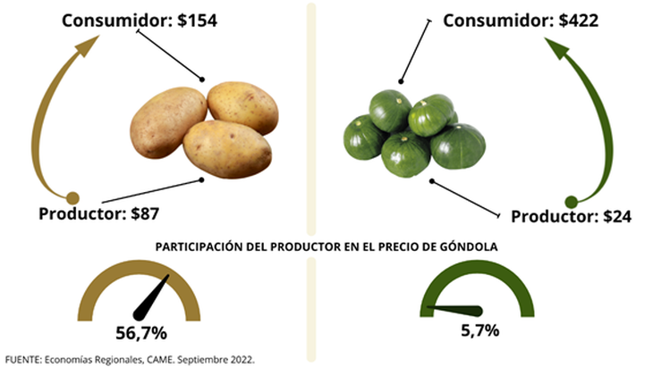 "En promedio, el productor explicó el 26,7% de los precios de venta final", indicó la Confederación, que a su vez precisó que "la mayor participación la obtuvieron los productores de papa (56,7%), mientras que la más baja la consiguieron los de zapallito (5,7%)", congruentemente con las brechas de precios en cada producto.
