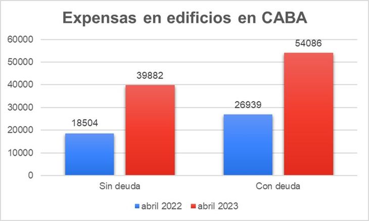 La expensa promedio en edificios en CABA considerando deudas en abril 2023 es de $54.086. Si se compara con la expensa de abril del 2022, de $26.939, el incremento interanual es del 100,7%. Sin embargo, está por debajo de la línea de la inflación que se ubicó en el 108,8% según el último dato relevado por el INDEC.