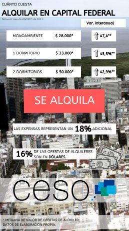 El alquiler de un monoambiente en la Ciudad Autónoma de Buenos Aires se ubicó en los $28.000 en agosto, de acuerdo a un informe de CESO, donde se resalta que el Salario Mínimo Vital y Móvil de $28.080 apenas alcanza para pagar el alquiler aunque difícilmente para cubrir expensas, servicios y otros gastos.
