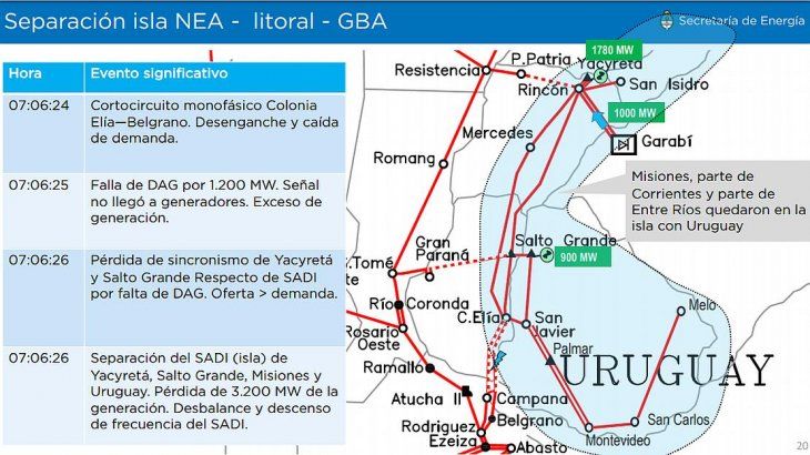 Estaban viniendo 1.780 megavatios de Yacyretá, un nivel bajo porque había poca agua en la hidroeléctrica ubicada sobre el río Paraná desde el 30 de mayo; 1.000 megavatios de Garabí (importado desde Brasil); y 900 megavatios desde Salto Grande.