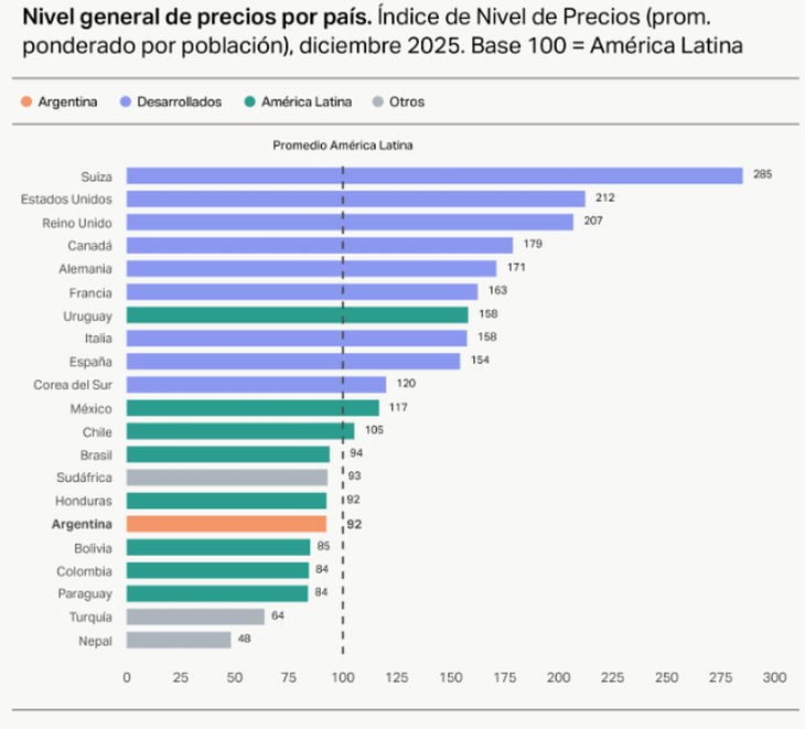 Un informe de Fundar, organización especializada en investigaciones sobre macroeconomía y desarrollo productivo, reflejó que el país se abarató 12% en términos relativos, entre noviembre de 2023 y diciembre de 2025. El dato surge de tomar en consideración la evolución del tipo de cambio oficial y el Índice de Nivel de Precios (PLI, por sus siglas en inglés) del Banco Mundial, que expresa el nivel de precios de un país como porcentaje del promedio mundial.