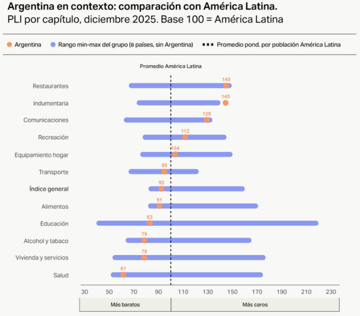 A nivel de producto, el PLI desagrega el consumo en 11 categorías. Según plasmó Fundar, en 6 de ellos Argentina es más barata: en Salud, Vivienda, Alcohol y tabaco, Alimentos y Transporte. Mientras que, en los siguientes 5 rubros los precios son más elevados: Restaurantes, Indumentaria, Comunicaciones, Recreación y Equipamiento para el hogar.