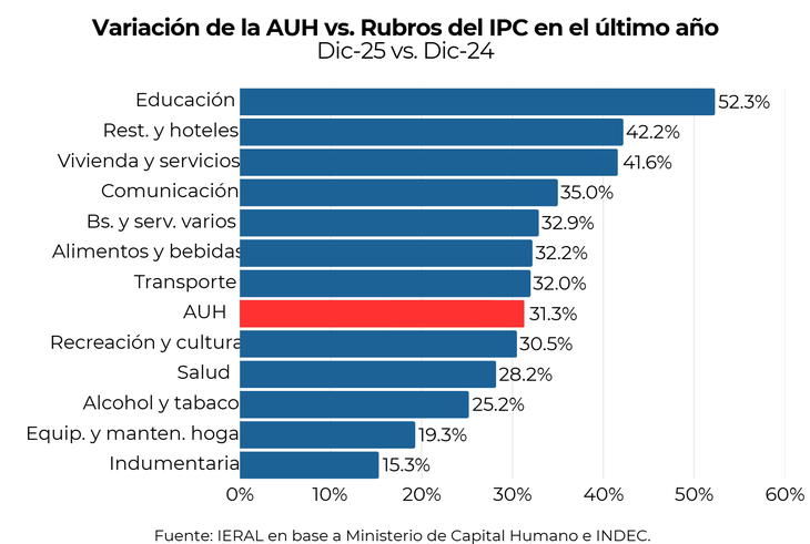 Más allá de la mejora real de la AUH, en el último año su poder de compra no avanzó parejo frente a los diferentes aumentos de precios de la economía. A modo de ejemplo, mientras la asignación aumentó 31,3%, la educación escaló 52,3%, vivienda y servicios 41,6%, alimentos y bebidas 32,2% y transporte 32%. De los doce rubros del IPC, la AUH solo superó a cinco.