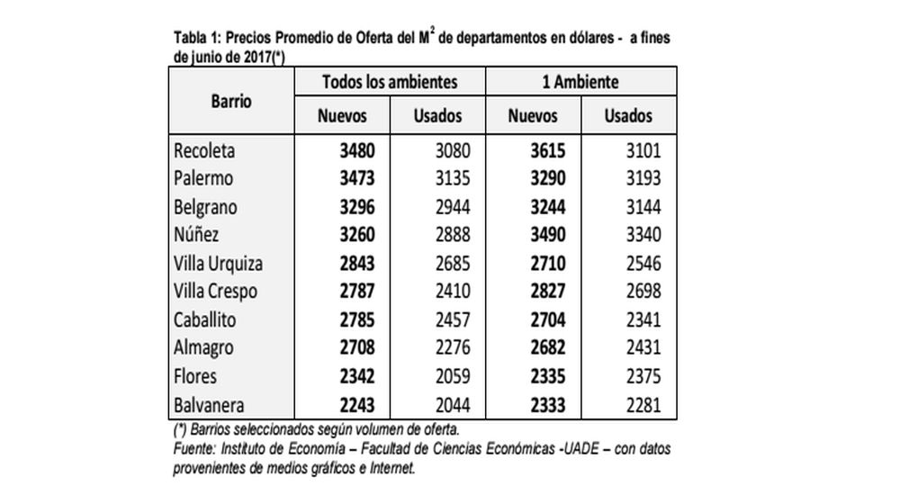Las unidades ubicadas en Recoleta, Palermo, Belgrano y Núñez registraron, tanto en el segmento de nuevos como usados, "los valores más elevados". En esas zonas, los precios de los departamentos a estrenar oscilaron entre 3.260 y 3.480 dólares el M2.