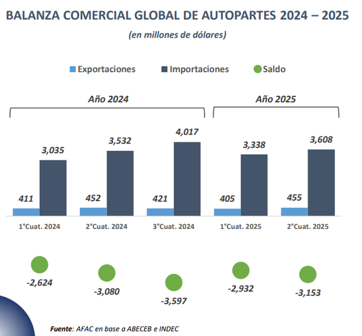 La balanza comercial de autopartes presentó un rojo de u$s6.085 millones en los primeros ocho meses de 2025 tras un aumento del saldo de 6,7% en ese período, según informó la Asociación de Fábricas Argentinas de Componentes (AFAC). De esta manera, ya se encuentra por encima del déficit del 2024, que fue de u$s5.703 millones.
