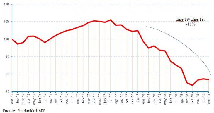 El Índice con base en enero de 2016=100, en este sentido, se encuentra apenas 2 puntos por debajo de una medición similar realizada para la economía brasileña (en función de su propia estructura productiva), que para diciembre de 2018 muestra un valor de 91 puntos.