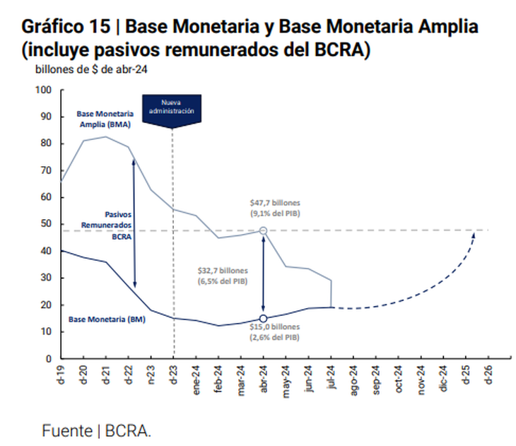 "Entre abril y junio se ha observado un incremento real y sin estacionalidad en el circulante en manos del público y en la base monetaria (incluyendo los encajes) de $2,1 billones y $6,2 billones, respectivamente. De esta manera la BM habría mostrado un punto de inflexión desde su mínimo de 2,5% del PBI marcado en marzo 2024. Los modelos de programación monetaria del BCRA anticipan la continuidad de un proceso de remonetización de la economía a lo largo del segundo semestre de 2024. En el escenario base del BCRA el grado de monetización esperada podría absorber el 21% de la liquidez ociosa determinada al momento de fijar la cantidad máxima de dinero (el nivel de la BMA del 30 de abril)", señaló el informe.