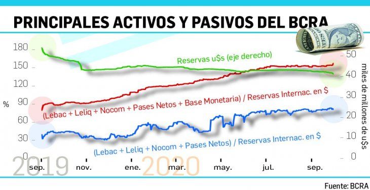 El balance del 2020 muestra al cabo de nueve meses una expansión de la base de $399.911 millones, donde los factores expansivos fueron el financiamiento al Tesoro de $1,706 billones ($533.500 M de Adelantos y $1,172 billones en Transferencia de utilidades) y el pago de intereses por $495.300 millones. Mientras que los factores contractivos fueron las Leliq (-$1,043 billones), los Pases (-$347.800 M), las ventas de reservas (-$331.576 M) y un aumento de los Depósitos oficiales de $66.500 millones. No puede soslayarse que el costo de la esterilización, en términos del pago de intereses, representa casi un tercio de la ayuda del BCRA al Tesoro. O sea, parte de lo que sale por la puerta, vuelve a entrar por la ventana. Cabe señalar que si bien el consenso del mercado considera que aún el stock de Leliq y de Pases no es hoy un problema, aunque deba resolverse más temprano que tarde, es inflación postergada, porque aún no es emisión. El stock de Leliq y de Pases es de casi $2,56 billones.