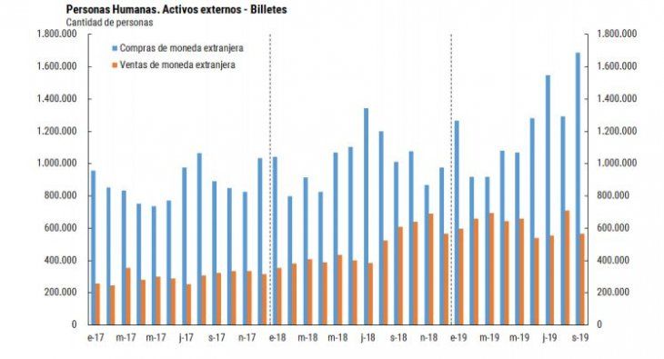 El informe del BCRA señaló que “la cantidad de individuos que compró billetes a través del mercado cambiario en septiembre (unas 1.690.000 personas), representaron un aumento de 30% con respecto al mes previo”.