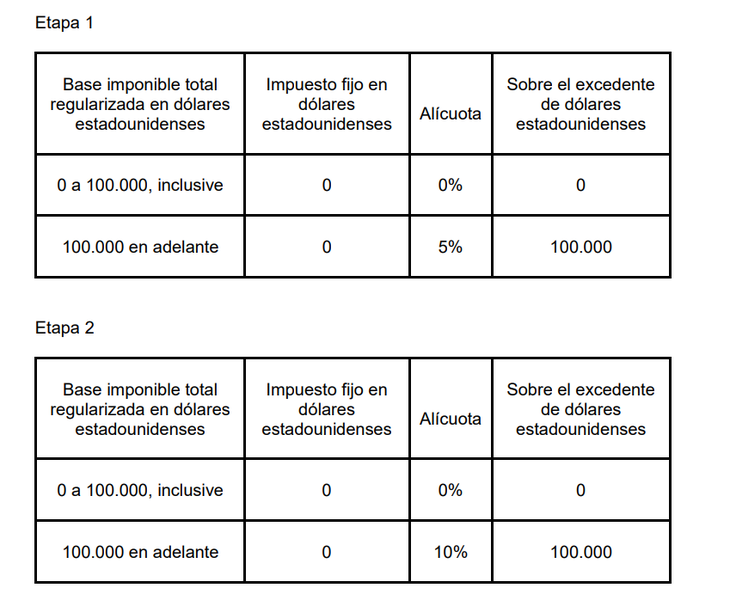 Si un mismo contribuyente decidiera regularizar bienes en más de una Etapa del presente régimen, sobre la base imponible de los bienes que regularice en las Etapa 2 y/o Etapa 3 corresponderá aplicar la alícuota del DIEZ POR CIENTO (10%) o QUINCE POR CIENTO (15%), respectivamente, sin considerar a tal fin la franquicia del primer escalón de la escala prevista en los párrafos anteriores en la medida que haya sido utilizada en su totalidad en la Etapa en la que el contribuyente hubiese regularizado bienes.