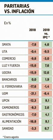 Luego de las PASO y de que se registrara en el escenario económico un impacto en materia de tipo de cambio e inflación, la mayoría de los gremios comenzaron a discutir con el sector empresario la posibilidad de actualizaciones salariales. Estas conversaciones fueron acompañadas por el debate sobre la entrega de un bono para trabajadores del sector privado, que finalmente decretó el Gobierno.