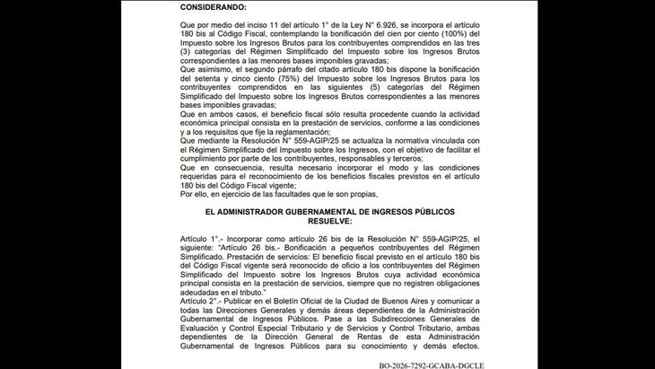El beneficio previsto en el artículo 180 bis "será reconocido de oficio" a los contribuyentes del Régimen Simplificado de IIBB "cuya actividad económica principal consista en la prestación de servicios, siempre que no registren obligaciones adeudadas en el tributo”, señala el documento publicado en el Boletín Oficial de CABA.
