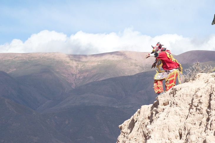 Luego llega el día de Carnaval, que es simbolizado por un muñeco en forma de diablo. También llamado el “Coludo”, se desentierra el sábado 10 de febrero de una apacheta de piedra, mientras los celebrantes brindan con chicha y bailan al compás de la música de anatas. Después recorren las calles del pueblo. Así continúan hasta el martes, cuando comienza la despedida del Carnaval y llega el momento de enterrar al Mandinga hasta el próximo año.