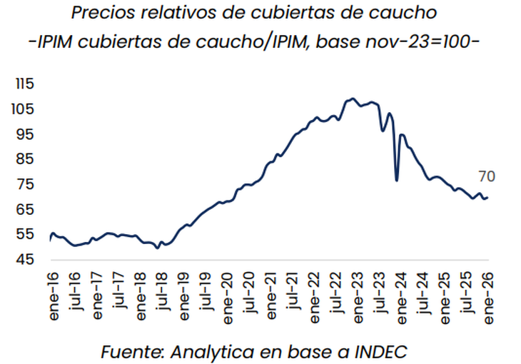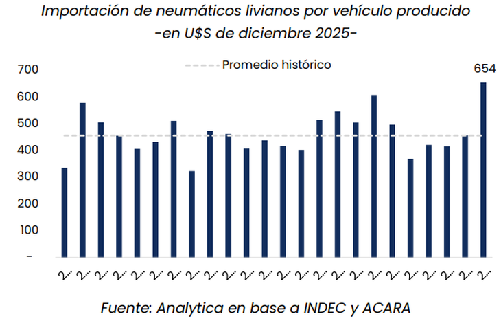 Un informe de la consultora Analytica expuso que, a precios constantes, las importaciones de neumáticos en 2025 alcanzaron un pico desde 2013. Asimismo, reflejó que por cada vehículo producido en el país se importaron u$s654 en neumáticos, el valor más alto de toda la serie histórica.