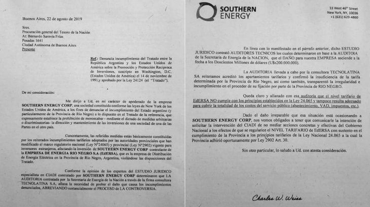 Southern envió una carta al procurador general del Tesoro, Bernardo Saravia Frías, en la que le informa que solicitará la intervención del Tribunal Arbitral del Banco Mundial (Ciadi) por lo que considera "reiterados incumplimientos tarifarios adoptados por el Estado argentino (y particularmente de la Provincia de Río Negro)".