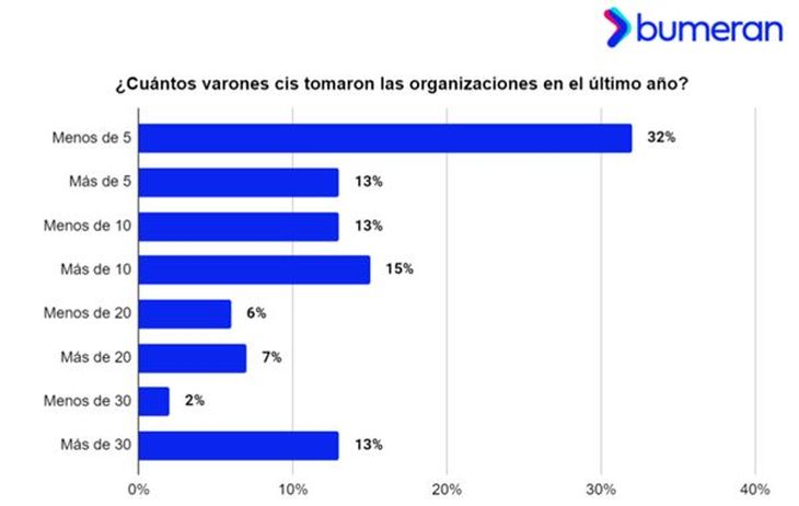 Durante el último año, el 32% de los especialistas en Recursos Humanos afirmó incorporar menos de 5 varones cis a sus organizaciones; el 15% manifestó sumar más de 10; y un 30% más de 30.