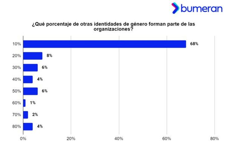 ¿Qué pasa con otras identidades de género? El 68% de los especialistas en Recursos Humanos expresa que solamente el 10% de personas que no se autoperciben como hombres cis o mujeres cis forman parte de sus organizaciones; y el 8% dice que un 20% integra sus empresas.