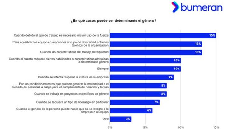 ¿En qué casos puede ser determinante el género? Para el 15% de los profesionales en HR el género es importante cuando el puesto requiera un mayor uso de la fuerza física; para el 13% cuando se necesita equilibrar los equipos o responder al cupo de diversidad; y para otro 13% cuando las características del trabajo lo requieren.