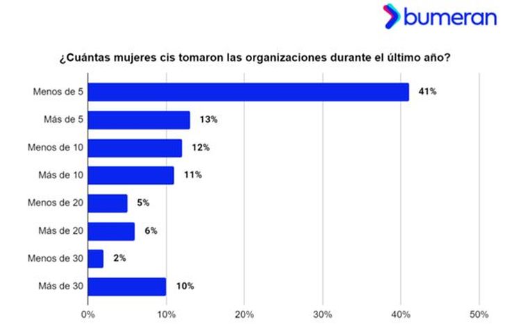 Respecto al género femenino, el 41% de los profesionales en HR incorporó menos de 5 mujeres cis a sus empresas; el 13% más de 5; y el 12% menos de 10.