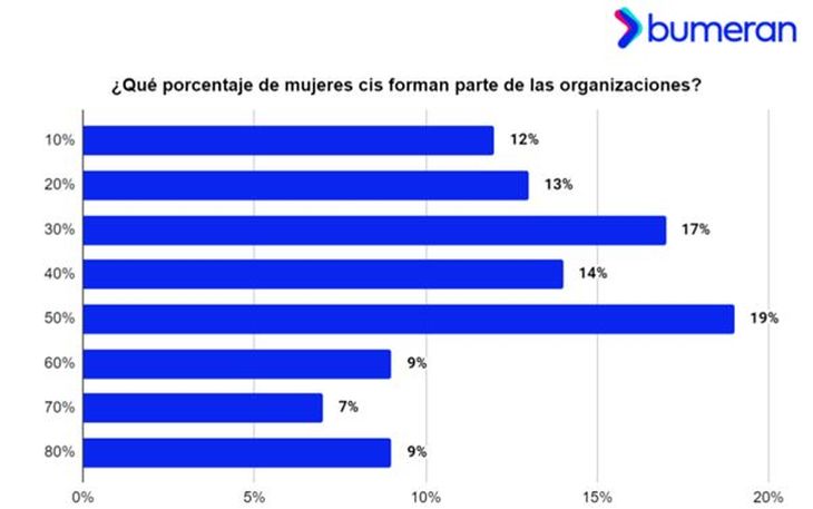 Con respecto a la cantidad de mujeres cis dentro de las organizaciones, el 19% de los profesionales en HR asiente que el 50% de las personas trabajadoras en sus empresas son mujeres cis; el 17% expresa que el 30% lo son; y el 14% afirma que 40% pertenecen al género femenino.