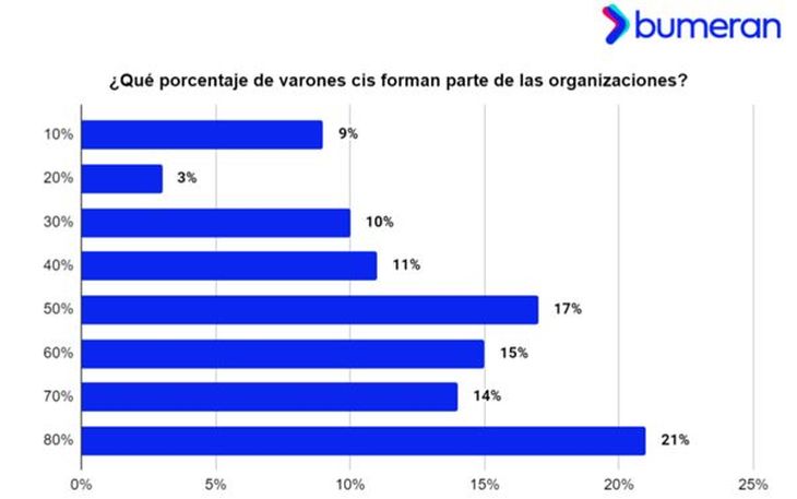 ¿Qué porcentaje de varones cis forman parte de las organizaciones? En Argentina, el 21% de los especialistas asegura que un 80% de los talentos de sus empresas son hombres; el 17% dice que un 50% lo son; y otro 15% manifiesta que el 60%.