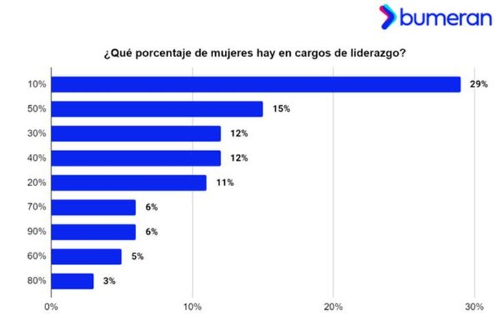 ¿Cuál es el porcentaje de mujeres ocupando cargos de liderazgo en las empresas de Argentina? El 29% de los talentos dice que hay un 10% de mujeres ocupando puestos altos; el 15% expresa que hay un 50% de presencia femenina; y para el 12% hay un 40% ejerciendo en roles de liderazgo o ejecutivos.
