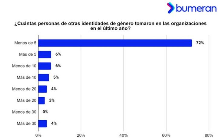 ¿Qué pasa con otras identidades de género? El 72% de los especialistas afirmó que se tomaron menos de 5 talentos que no se identifican ni con el género masculino, ni femenino; el 6% dice que incorporaron más de 5; y otro 6% menos de 10 postulantes.