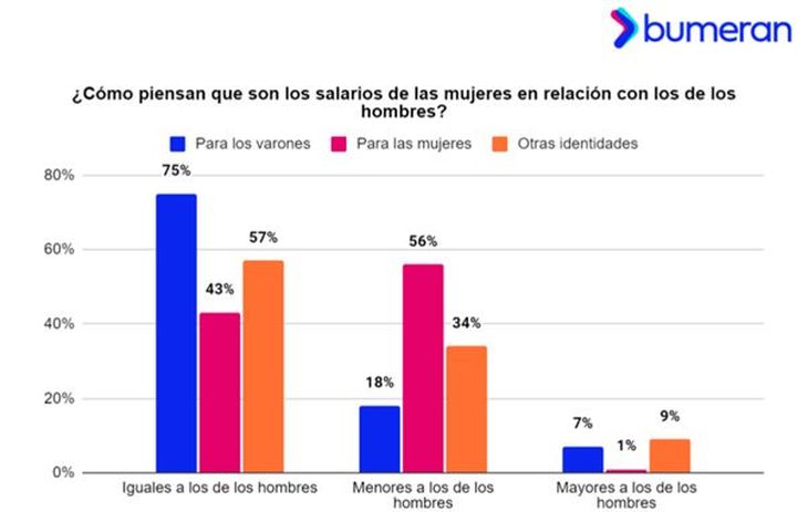 Según el estudio Perspectivas de género en el mundo laboral de Bumeran, portal líder de empleo de Latinoamérica, existe una diferente apreciación respecto a la paridad salarial en Argentina: para el 75% de los varones no hay una diferencia en el salario entre hombres y mujeres; mientras que el 56% de las mujeres sostiene que su sueldo es menor.