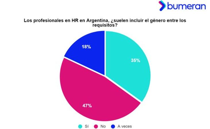 El 53% de los profesionales en Recursos Humanos sostiene que suele incluir al género entre los requisitos de los anuncios laborales, el 35% de “sí” y el 18% “a veces”. En la región, la situación es similar: en Ecuador el 63% expresa que específica el género como un factor necesario en las búsquedas laborales; el 57% en Panamá; el 48% en Chile; y el 47% en Perú.