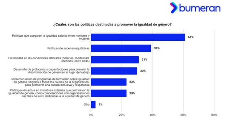 ¿Cuáles son las políticas destinadas a promover la igualdad de género? El 61% señala medidas para asegurar la igualdad salarial entre hombres y mujeres que desempeñan funciones similares o idénticas en la organización; el 39% políticas de ascenso equitativas, para garantizar que hombres y mujeres tengan igualdad de oportunidades para acceder a puestos de liderazgo y ejecutivos dentro de la empresa; y el 31% flexibilidad en las condiciones laborales (horarios, modalidad, licencias, entre otras).