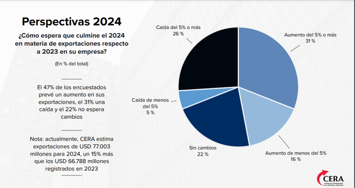 A pesar de ello, las empresas esperan una mejora. “Para 2024, el 47% de los encuestados prevé un aumento en sus exportaciones comparado con 2023, el 31% espera una caída y el 22% cree que no habrá cambios”, dice el reporte.