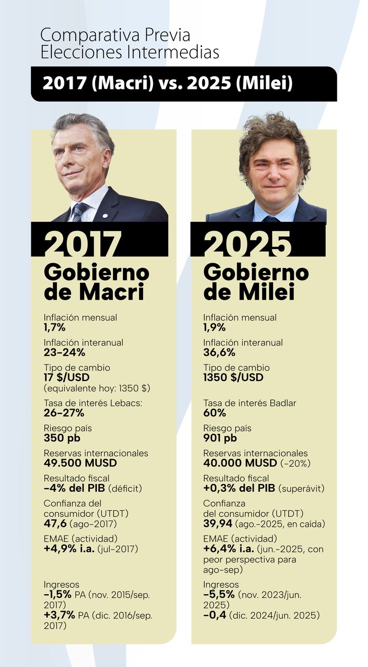 Cuando el gobierno de Macri enfrentaba las elecciones legislativas, Argentina tenía una inflación más baja, un tipo de cambio más estable y una confianza del consumidor más alta. Sin embargo, el punto de partida o la "herencia" que recibió su administración fue diferente a la que encontró el libertario en 2023. Milei, por su parte, enfrenta un entorno más desafiante con mayor inflación acumulada, pero en franco descenso, un riesgo país más elevado y un menor índice de confianza en la previa de los comicios.