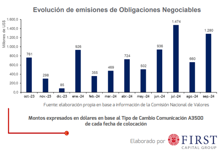 En septiembre, hubo un incremento considerable en la colocación de ON en dólares. Según datos oficiales recopilados por First Capital Group, totalizó u$s1.123 millones. Y octubre comenzó con una continuidad del boom de este tipo de financiamiento.