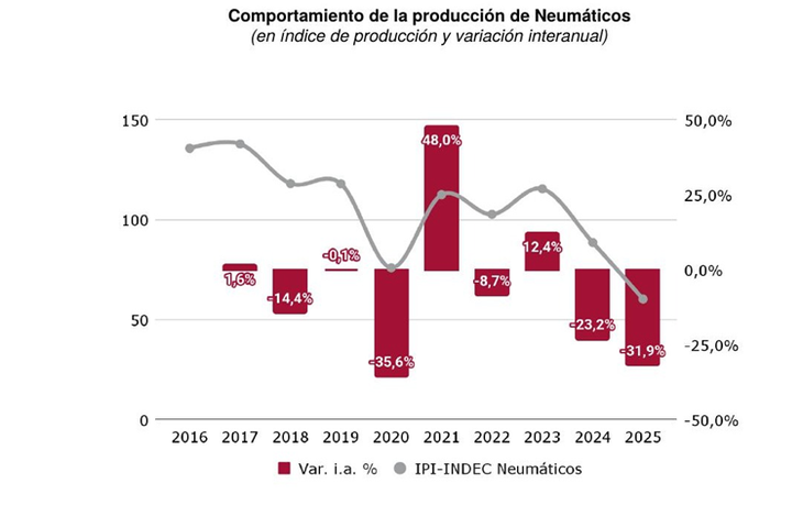 En 2025, la producción de neumáticos cayó un 33% frente a los datos del 2023, luego de caer desde las 9 millones de unidades producidas a 6 millones. En tanto, el uso de la capacidad instalada en diciembre de ese mismo año retrocedió 8,6 puntos porcentuales (p.p.) a un 33,4% interanual.