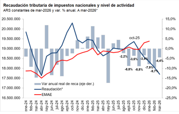 Según Quantum, la combinación entre caída de recaudación y mejora de la actividad se debería a la composición sectorial del crecimiento, con participación de los sectores agropecuario, petróleo y gas, minería y servicios financieros, en contraste con los sectores comercio e industria, que experimentan reducciones, el incremento de la informalidad en sectores afectados por la competencia externa y la reducción de las alícuotas de algunos impuestos, entre otros.