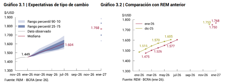 Entre el 28 y el 30 de enero, el BCRA recopiló las proyecciones de 33 consultoras y centros de investigación, y de 12 entidades financieras. La mediana de las respuestas arrojó un dólar oficial esperado de $1.475, en promedio, para febrero, lo cual implicaría un incremento mensual del 1,8%.
