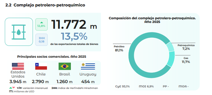 El segundo lugar lo ocupó nuevamente el complejo petrolero-petroquímico, uno de los que registró un récord de ventas, que se dirigieron principalmente a Estados Unidos, Chile y Brasil, y fueron impulsadas particularmente por el petróleo crudo. Aquí el "share" fue del del 13,5%, superior al 13,1% del año previo.