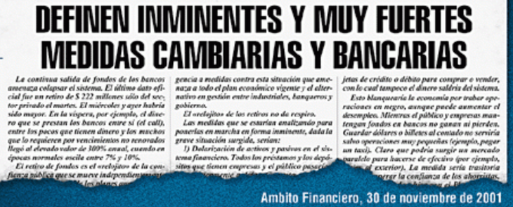“Definen inminentes y muy fuertes medidas cambiarias y bancarias”, era el título de Ámbito Financiero el 30 de noviembre de 2001. A continuación, un detalle de las medidas: dolarización total de activos y pasivos del sistema financiero, se podría disponer de que todo el movimiento monetario se haga en cheques y habría que justificar los fondos que se envíen al exterior.