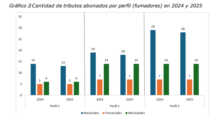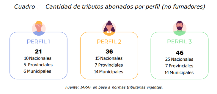 El reporte indica que una persona que no consume cigarrillos (ya que estos pagan impuestos) en el primero de los casos paga al año 21 impuestos al año (10 nacionales, 5 provincias, 6 municipales) , el segundo 36 (15 nacionales, 7 provinciales, 14 municipales) y el tercero 46 tributos (25 nacionales, 7 provinciales, 14 municipales).