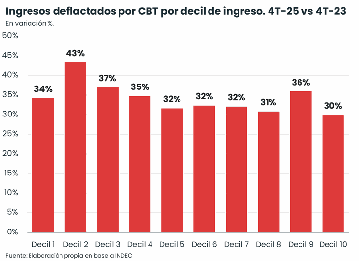 "Todos los ingresos provenientes de la EPH vuelan contra fines de 2023 (piso en captación de ingresos) y quedan entre 30% y 40% por encima deflactados por la Canasta Básica Total (CBT). No son puntualmente los informales ni los deciles cercanos a la línea de pobreza, son todos. Tampoco se explica sólo porque las canastas subieron menos que la inflación (efecto precios relativos). La principal razón es que la captación mejoró notablemente en todos los niveles", afirmó Gonzalo Carrera, economista de Equilibra.