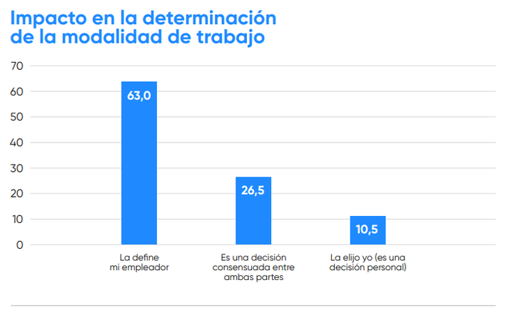 De hecho, según el relevamiento, hoy menos de un 30% trabaja de manera 100% presencial, mientras que solo un 7% lo hace de forma totalmente remota. El formato que predomina es el híbrido, con el 63,5% de los encuestados.