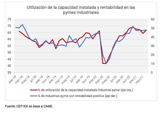 El reporte del Ministerio también cuestionó "otro dato de CAME inconsistente con otros que reporta la misma entidad, como la utilización de la capacidad instalada industrial pyme (que en abril de 2021 fue casi 10 puntos superior a abril de 2019) y el porcentaje de pymes industriales con rentabilidad positiva, que en abril de 2021 fue del 48%, casi 20 puntos porcentuales por encima de lo reportado en abril de 2019 (29,5%).