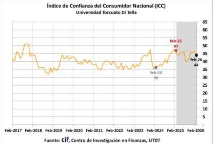 “Nosotros creíamos que luego de un 2025 donde los bienes durables le ganaron la pulseada al consumo masivo, en 2026 sería nuestra revancha, pero no está pasando”, le dijo a Ámbito la representante de una firma líder. Sobre el fin de la semana, la Universidad Di Tella reflejó el clima que se respira en las góndolas con una caída del 4,7% mensual del Índice de Confianza del Consumidor durante febrero.