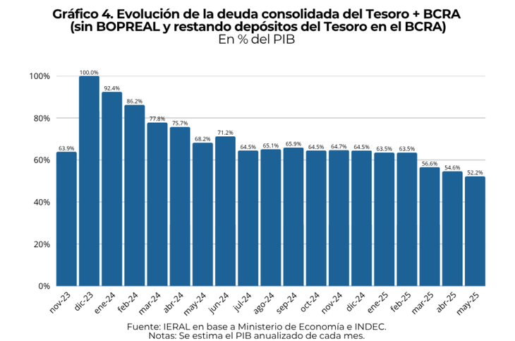 Por caso, el trabajo indica que la deuda consolidada del Tesoro y el Banco Central pasó del 63,9% del PBI en noviembre de 2023 al 52,2% del PBI en mayo de 2025, lo que marcó una caída del 18,2%. En términos absolutos a moneda constante, pasó de $542,145 billones a $535,444 billones en el mismo período con una caída del 1,2%.