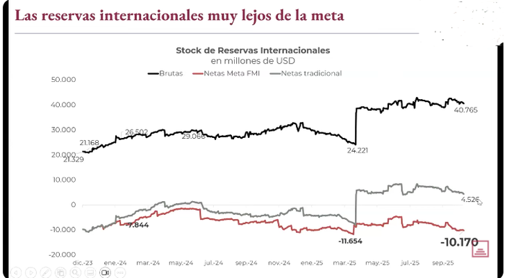 De acuerdo con la sociedad de bolsa, las reservas brutas a octubre suman u$s40.765 millones como producto del préstamo del FMI y otras operaciones. Las reservas netas, en la forma tradicional de medición, estarían en u$s4.526 millones positivas, pero en la manera en que las estima el FMI quedarían en u$s -10.170 millones.