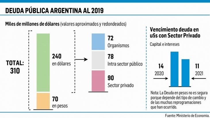 C.R.: Una parte está en pesos y otra en dólares; y nosotros no producimos dólares sino pesos. Imprimimos pesos. Esa parte de la deuda debe negociarse y reperfilarse. Hablemos de la deuda en dólares que es la que realmente duele. Un porcentaje altísimo está en poder del sector público. Otra parte, unos u$s72.000 millones, está contraída con organismos financieros internacionales. Esa se refinancia. Lo que queda es la deuda con el sector privado en dólares, que llega a un total de unos u$s90.000 millones, sumando colocaciones locales y en Nueva York. Entonces tenemos que de u$s310.000 millones pasamos a u$s90.000 millones. Esa es la deuda que hay que negociar.